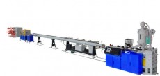 原料+色母料→混合→真空上料→原料干燥→單螺桿擠出機→四色線擠出機→籃式或是螺旋模具→定徑套→噴淋真空定型箱→噴淋真空定型箱→噴淋冷卻水箱→噴淋冷卻水箱→色帶印字機→履帶式牽引機→行星切割機→管材堆放架→成品檢測包裝。